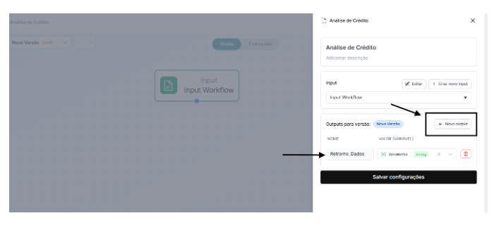 Os outputs são totalmente configuráveis e devem ser definidos de acordo com as necessidades específicas de cada workflow e do processo de negócio que ele representa, garantindo clareza, padronização e integração com outros sistemas.